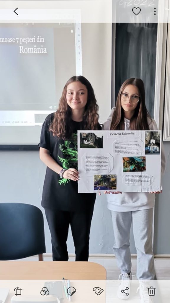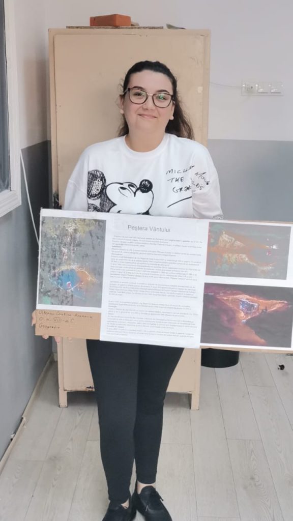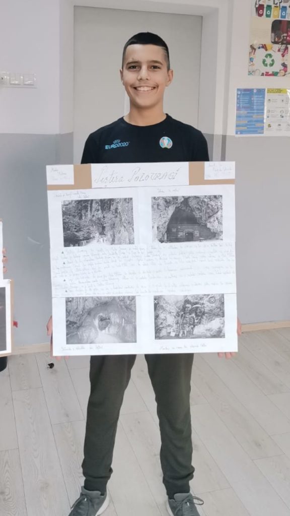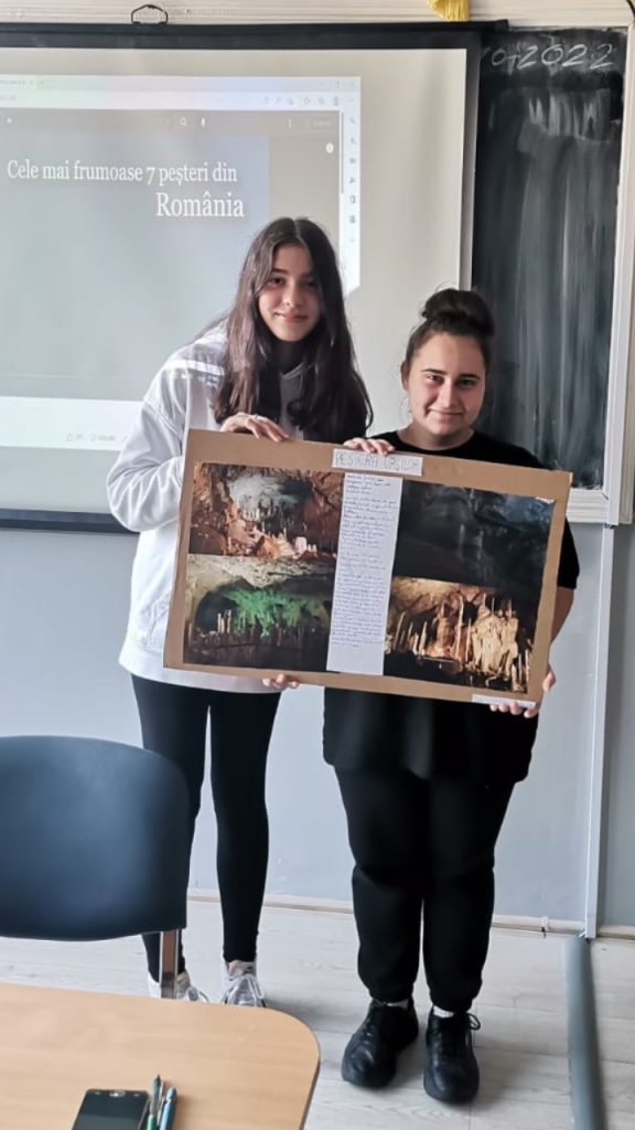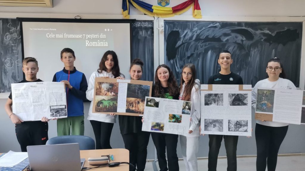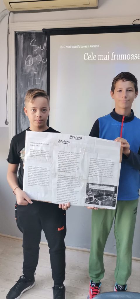 Elevii au prezentat colaje cu o peșteră din Romania la alegere și au vizionat filmulețe despre peșteri și relieful carstic.